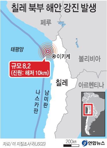 칠레 북부 해안 인근 태평양에서 1일 오후 8시46분(현지시간)께 규모 8.2의 강진이 발생했다.