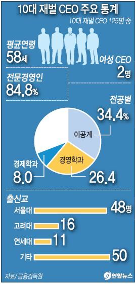 또 경영학이나 경제학 전공자를 합하면 이공계 출신과 규모가 비슷해 재벌그룹 CEO의 양대 축을 형성했다. 10대재벌 CEO들의 평균 나이는 58세다.