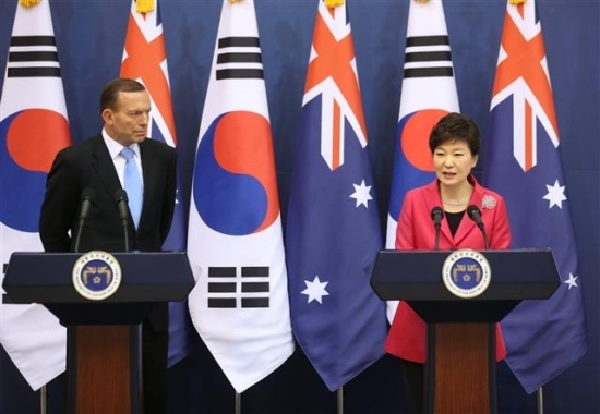 | ▲ 박근혜 대통령과 토니 애벗 호주 총리가 8일 청와대에서 한-호주 FTA 정식 서명 등과 관련한 공동 기자회견을 하고 있다. 연합뉴스 | ||