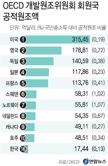 OECD가 8일(현지시간) 발표한 작년 DAC 회원국 공적원조 실적에 따르면 한국은 17억4000만 달러(약 1조8240억원)로 전년보다 4.8% 증가했다. 순위는 전년도에 이어 16위를 지켰다.