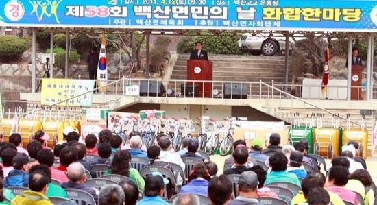 이번 면민의 날에서는 백산면 파랑새풍물단의 흥겨운 풍물놀이 공연을 시작으로 기념식과 줄다리기 등 6개 종목의 체육경기가 진행됐다. 여기에 명국환 등 유명연예인의 축하공연과 면민노래자랑이 이어지며 참석자 모두가 하나되는 화합 한마당 축제가 되었다.