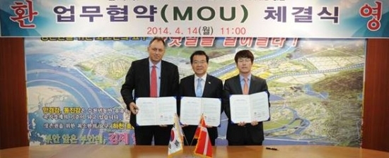 김제시는 14일 상황실에서 이건식 시장을 비롯 헤닝 덴마크 하슬레브 사장, 박준완 유코브릿지社 사장 등 10여명이 참석한 가운데 북유럽 선진 축산시스템 관련시설 중 유기성폐자원을 이용안 생산시설과 동물성폐자원을 활용한 단미사료 제조시설인 랜더링 시설을 도입 하기 위한 업무협약을 체결했다.