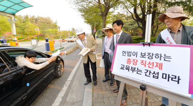 전북대 총장 선출방식을 놓고 대학본부와 교수회가 소송을 진행하는 등 갈등을 빚고 있는 가운데 14일 전북대학교 교수회 임원들이 전북대 신정문에서 ‘헌법이 보장하는 총장 직선제 교육부는 간섭 마라’는 피켓을 들고 홍보문을 나눠주고 있다.