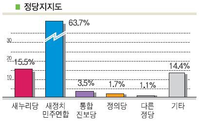현재 지지하거나 조금이라도 더 호감이 가는 정당을 묻는 질문에 도민들은 63.7%가 새정치민주연합을 꼽았다. 또 새누리당 15.5%, 통합진보당 3.5%, 정의당 1.7% 순으로 나타났고, 기타 다른 정당을 지지한다는 응답은 1.1%였다. 또 ‘지지하는 정당이 없다’는 무당층은 14.4%로 집계됐다.