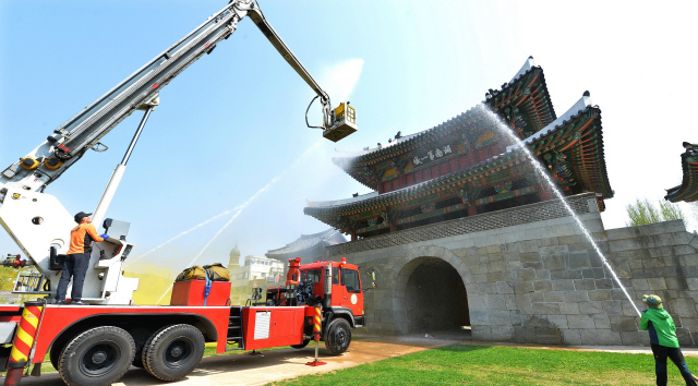 14일 전주 풍남문에서 열린 중요목조문화재 소방 합동훈련에서 소방관과 관계자들이 대형 크레인 화재진압장비를 동원해 훈련을 하고 있다.
