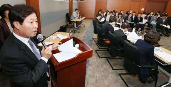 ▲ 전주시 규제개혁을 위한 발굴 토론회가 16일 전주시청 4층 회의실에서 열린 가운데 장명균 기획예산과장이 규제개혁 추진 계획에 대한 발표를 하고 있다. 사진제공=전주시청
