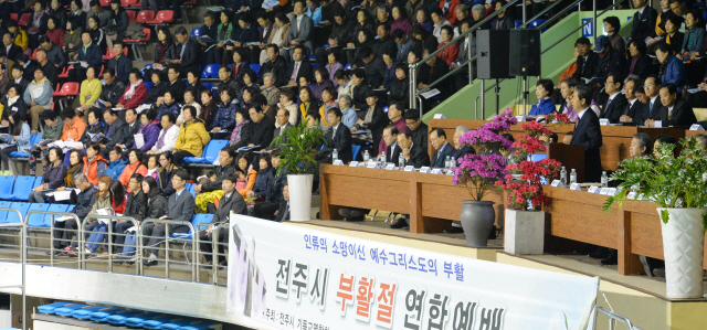 부활절인 20일 전국적으로 세월호 침몰 사고를 두고 예배와 미사가 열린 가운데 전주 실내체육관에서 열린 전주시 부활절 연합예배에 참석자들이 기도를 하고 있다.
