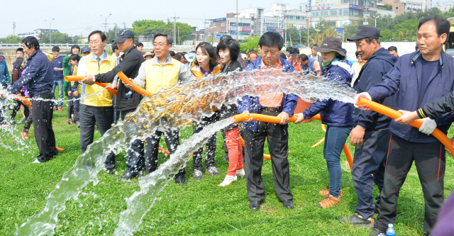 21일 전주 완산구청 주최로 삼천동 마전교에서 열린 이상기후에 따른 국지성 폭우 및 농경지 피해대비 양수기 현장교육에 참석자들이 양수기 시연을 하고 있다.