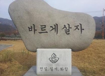 잘 가꾸어진 공원 한쪽에 이런 큼직한 돌을 세우고 거기에 ‘바르게 살자’고 적어 넣어서 이 땅의 수많은 ‘바르지 못한’ 사람들의 잘못된 의식과 생활방식을 뜯어고치고 싶어하는 이들은 또 과연 얼마나 바르게 살아가고 있을까 싶은 생각도 든다.
