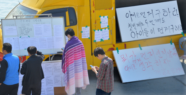 | ▲ 세월호 참사 9일째인 24일 진도 팽목항에서 실종자 가족들이 구조현황판을 보고 있다. 진도 팽목항=추성수기자chss78@ | ||