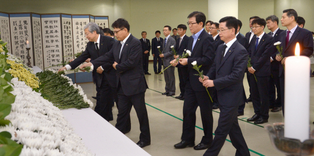 ▲ 28일 오후 도청 공연장에 마련된 세월호 참사 희생자 합동분향소에서 전북은행 임직원들이 헌화 후 희생자들을 추모하고 있다. 안봉주기자 bjahn@