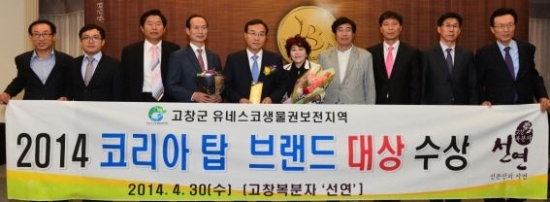 서비스마케팅학회·(사)한국언론인협회·동아일보가 주최하고 한국지속경영평가원이 주관하여 지난 30일 한국프레스센터에서 열린 ‘2014 코리아 탑 브랜드 대상’ 시상식에서 고창복분자 선연이 특산품 브랜드 부분 대상을 수상, 다시 한번 그 명성을 국내외에 알렸다.