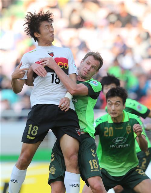 ▲ 6일 전주월드컵경기장에서 벌어진 아시아축구연맹(AFC) 챔피언스리그 조별리그. 전북 윌킨슨이 포항 고무열의 헤딩슛을 잡으며 차단하고 있다. 연합뉴스