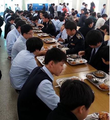 | ▲ 정읍경찰서 학교전담경찰관들이 관내 중·고등학교 학교식당을 방문해 학생들과 점심을 먹으며 학교폭력 예방을 위한 이야기를 나누고 있다. | ||