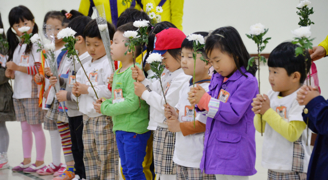 ▲ 세월호 참사 22일째인 7일 전북도청 대강당 합동분향소에서 유치원생들이 헌화하고 있다. 추성수기자chss78@