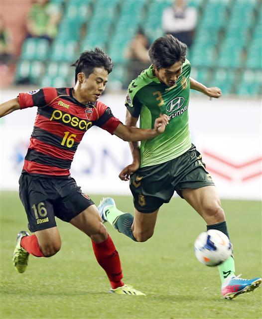 ▲ 13일 포항 스틸야드에서 열린 AFC 챔피언스리그 전북-포항 간 16강 2차전에서 전북 이재명(3번)이 포항 이광훈(16번)의 마크를 받으며 드리블하고 있다. 연합뉴스