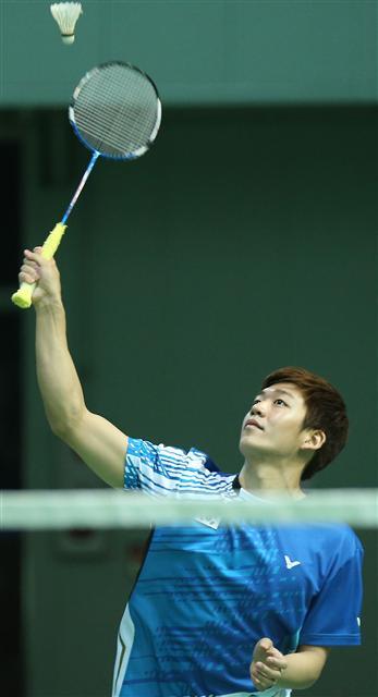 ▲ 14일 오후 서울 노원구 태릉선수촌 오륜관에서 열린‘2014 세계 남·여 단체배드민턴선수권대회’미디어데이 행사가 끝난 뒤 이용대가 훈련을 하고 있다. 연합뉴스