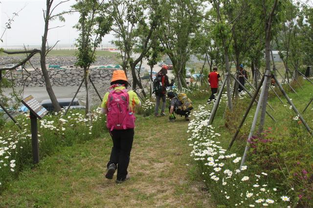 마실길 양쪽으로 줄을 지어 하얗게 핀 데이지 꽃은 살랑거리는 봄바람에 몸을 맡긴 채 관광객들을 유혹하고 있으며 관광객들은 스마트폰과 카메라 셔터를 연신 누르면서 아름다운 경치를 담기에 한창이다.