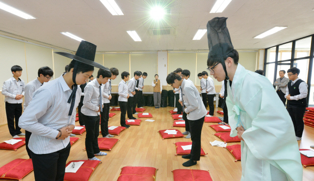 세월호 참사 여파로 도내 초·중·고에서 스승의 날의 행사가 대폭 축소된 가운데 동암고는 예절교육을 통해 교사들에게 감사인사를 전했다. 벌써 4년 째다. 올해는 1학년 예절교육, 2학년 체험, 3학년 성년례로 이어진다.