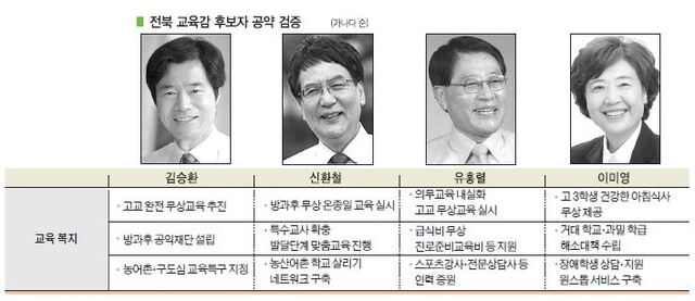 교육감 선거에 도전장을 낸 김승환·유홍렬·이미영 후보, 신환철 예비후보는 무상급식·무상교육 등 ‘공짜’ 공약을 앞다퉈 내놓고 있다. 하지만 김승환 후보를 제외한 3명 후보들은 공약 관련 비용 산출, 단계별 세부과제 등을 빠뜨려 구체성이 떨어진다는 지적이다. 더욱이 4명의 후보들이 예산 확보를 위해 공동 세수 부담을 지는 자치단체와의 공조 외에 재원 마련 대책을 내놓는데 한계가 있어 실행가능성도 의문시되고 있다.