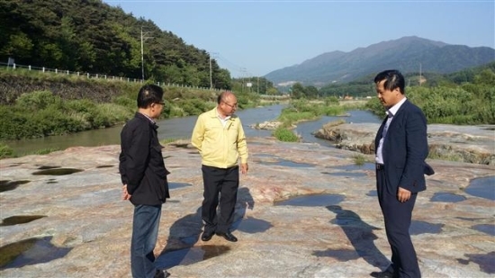 ▲ 김희옥 운봉읍장, 허관 남원시 공보담당, 김용근 계장 등이 19일 피바위를 둘러 보고 있다.