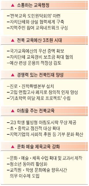 이 후보의 5대 공약은 △소통하는 교육행정 △전북교육예산 3조원 시대 △경쟁력 있는 전북인재 양성 △아침을 주는 전북교육 △문화·예술·체육 강화다.