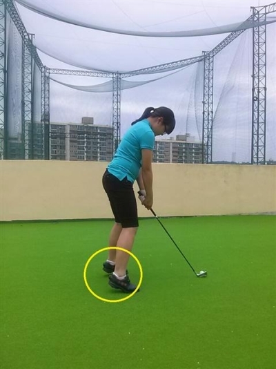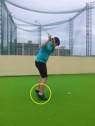 어드레스 자세를 취하고 <사진1> 과 같이 양발의 뒤꿈치를 들어본다. <사진2> 는 백스윙과정에서 뒤꿈치의 들고 있는 자세를 유지하는 동작이다. 뒤꿈치를 들고 있으면 몸의 중심을 잡기위해서 상체를 세울 수가 없다. 따라서 상체가 들리는 동작이 줄어들게 되며, 이 동작 후 다운스윙과정에서 <사진3> 과 같이 뒤꿈치를 내리면서 다운스윙을 하는 것이다. 이 다운스윙을 할 때 뒤꿈치가 동시에 같이 내려가면 상체가 내려가기 때문에 임팩트 순간에 가슴이 들리는 동작이 방해가 된다. 따라서 자연스럽게 상체가 들리지 않게 되는 것이다. 사진3> 사진2> 사진1>