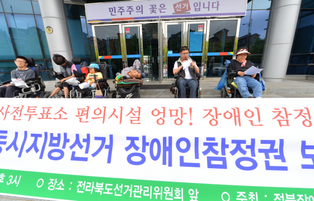 속보= 장애인차별철폐연대(장차연)는 6·4전국동시지방선거를 하루 앞둔 3일 전북도선거관리위원회 앞에서 기자회견을 열고, 장애인 참정권을 보장할 것을 촉구했다. ·(2일자 9면 보도)