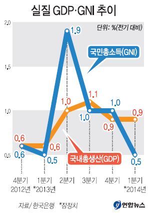 이는 2012년 1분기(0.3%) 이후 가장 낮은 수준이다. 작년 1분기에도 0.5% 증가했지만 소수점 둘째 자리까지 따지면 이번이 더 낮다. 전분기 대비 실질 GNI 증가율은 작년 2분기 1.9%로 상승했다가 3분기 1.0%, 4분기 1.0%로 둔화했으며 결국 올해 들어 0%대로 한단계 더 떨어졌다.
