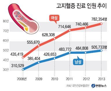 8일 국민건강보험공단 통계에 따르면 고지혈증(질병코드 E78) 환자는 2008년 74만6000명에서 2013년 1.7배인 128만8000명으로 늘었다. 관련 진료비도 같은 기간 1558억원에서 2114억원으로 36% 불었다 연령대별 10만명당 진료 인원은 남성의 경우 지난해 기준 60대(4797명)가 가장 많았고, 이어 50대(4042명)·70대(6971명) 순이었다. 여성 역시 60대(1만241명)·50대(7550명)·70대(6971명)의 비중이 컸다. 연합뉴스