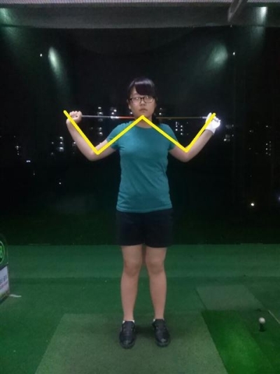 C-자세를 교정하는 방법으로는 <사진2> 와 같이 클럽을 활용하여 자세를 취하면 쉽게 교정할 수 있다. 그립과 헤드를 양손으로 쥐고 어깨 뒤로 넘겨 잡아서 W 모양으로 만들어 주면 된다. 여기까지는 매우 쉽지만 <사진3> 과 같이 어드레스를 취할 때는 다시 등이 C-자세로 돌아가면 안 된다.