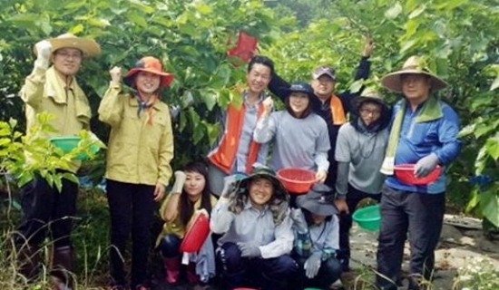 옹동면(면장 유용) 직원과 이장협의회. 부녀회원 등 14명도 옹동면 산성리 소칠마을 왕기경씨 오디 밭(1750㎡)에서 오디 수확을 도왔다.