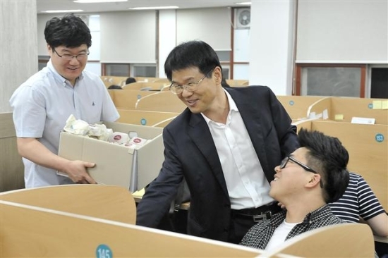 우석대 김응권 총장이 늦은 시간 학습도서관을 찾아 시험공부에 여념이 없는 학생들을 응원했다.