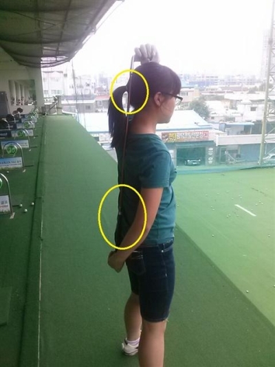 척추를 펴는 동작은 쉽지 않지만 오늘 배우는 연습을 해보면 효과 가장 클 것이다. 먼저 7번 아이언을 준비하고 사진1과 같이 척추 선을 따라 클럽을 등에 가져다 대는 동작을 취한다. 그리고 사진2의 모습은 옆모습이 되는데, 여기에서 눈여겨 볼 것은 허리 부분이 클럽과 등이 공간이 없어야 한다. 공간이 생기면 척추를 펴주는 동작이 어려워지게 된다. 또한 머리의 뒷부분과 클럽이 닿아야 한다.