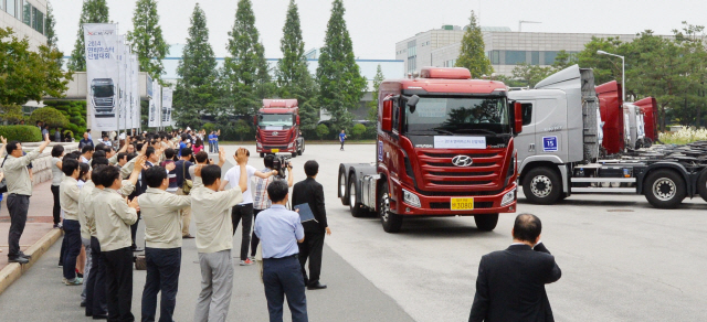 ▲ 20일 현대자동차 전주공장에서 열린 ‘2014 트라고 엑시언트 연비마스터 선발대회’에 10:1의 지역예선을 거친 15명의 우수 연비 고객들이 대형트럭 ‘트라고 엑시언트’를 운전하며 출발하고 있다. 추성수기자 chss78@