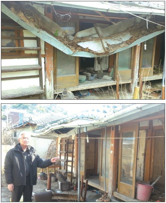 | ▲ 사진 위는 지난 19일 김제 원평집강소 대청 처마 부분이 무너져 내린 모습. 석달 전인 지난 3월 18일 김덕명 장군의 증손자인 김석태 전국동학농민혁명유족회장과 함께 방문했을 당시(아래)와 비교해 붕괴가 빠르게 진행되고 있다. | ||