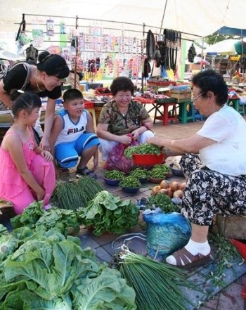 ▲ 무주군 반딧불 야시장에서 구경온 가족들이 농산물을 흥정하고 있다.