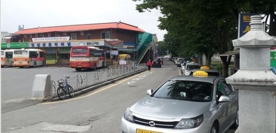 ▲ 노폭이 협소한 임실 천변도로에 영업용 택시가 상시 대기하고 있어 불편이 가중되고 있다.