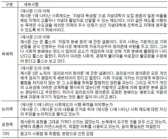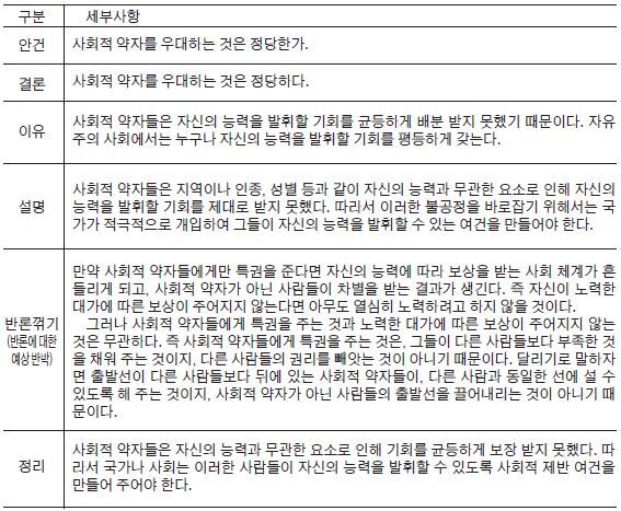또한 〈제시문 3〉의 주장에 대한 반증으로 우리 사회가 빈익빈 부익부의 사회임을 들고 있다. 그러나 이는 근거로 적절해 보이지 않는다. 왜 ‘지방대 육성법’이 개인의 권리를 침해하는 것이 아닌가에 대한 적절한 근거를 드는 것이 좋았으리라 생각한다.