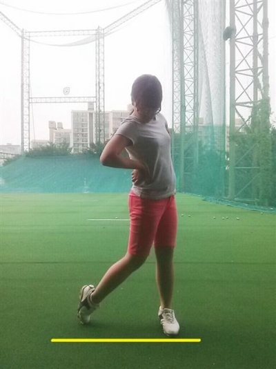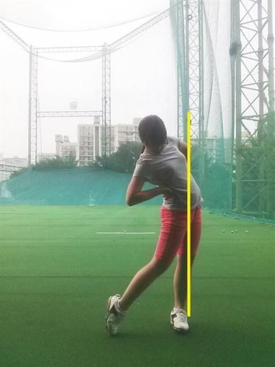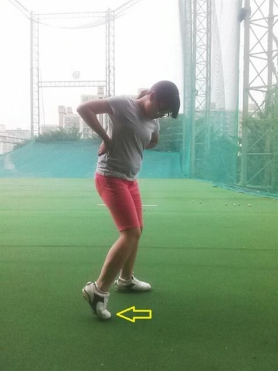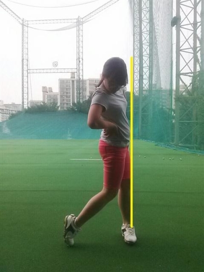 먼저 <사진1> 의 동작은 슬라이딩이 되지 않고, 원활한 회전을 동반한 스윙이다. 왼쪽 복사뼈를 기준으로 수직선이 한계선이라 생각하면 된다. 고관절의 위치가 정면에서 봤을 때 선을 넘어서면 안 된다. 반대로 선을 축으로 회전이 이루어져야 하는데, 선에 너무 도달하지 않으면 회전이 뒤로 움직인 동작이 되므로 좋지 않은 스윙이 된다. <사진2> 는 가장 많이 만들어지는 좋지 않은 예의 하나이다. 고관절과 무릎이 이미 경계선을 지났기 때문에 회전하는데 많은 악영향을 미치는 것이다. 사진2> 사진1>