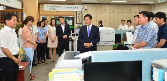 | ▲ 박우정 고창군수가 지난 1일 취임식을 마친 후 군의회 및 군청 실과소를 방문해 직원들과 첫 만남의 시간을 갖고 있다. | ||