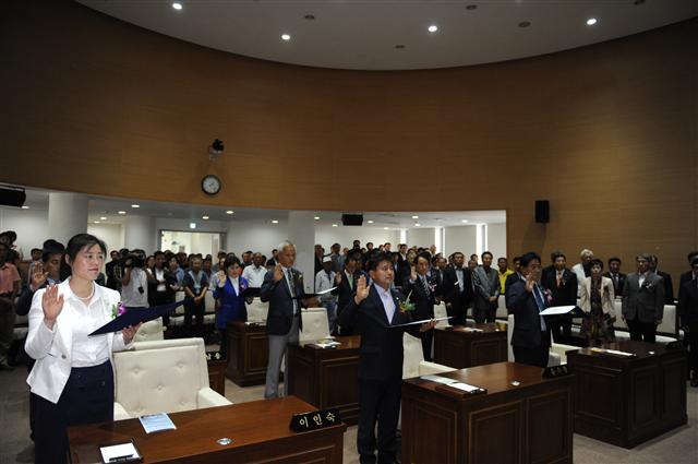 | ▲ 지난 4일 오후 2시 완주군의회 본회의장에서 열린 제7대 완주군의회 개원식에서 의원들이 선서를 하고 있다. | ||