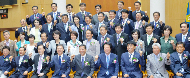 ▲ 제10대 전주시의회 개원식이 7일 본회의장에서 열린 가운데 전반기 의장으로 선출된 박현규 의장과 의원들이 화이팅을 외치며 기념촬영을 하고 있다. 추성수기자 chss78@