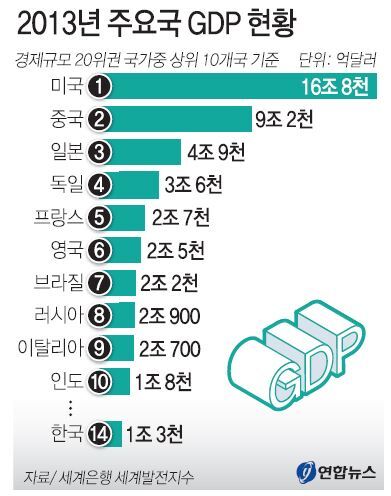 13일 한국은행과 세계은행의 세계발전지수(World Development Indicators) 자료에 따르면 2013년 한국의 명목 국내총생산(GDP) 규모는 1조3045억달러로 전 세계에서 14위를 차지했다.