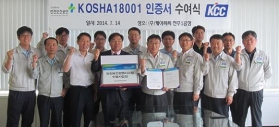 안전보건공단 전북지사는 14일 (주)KCC 전주1공장 회의실에서 (주)KCC 전주1공장에 안전보건경영시스템(KOSHA 18001) 인증서를 수여했다. 안전보건경영시스템은 사업장의 자율안전보건 경영체제 구축·적용 여부와 근로자의 건강 증진 활동 등을 종합적으로 심사해 인증하는 제도다. 완주산업단지에서 플라스틱 가공제품을 생산하는 (주)KCC 전주1공장은 지난 4월 안전보건공단에 인증을 신청한 뒤 실태 조사와 인증 심사를 거쳐 안전보건경영시스템 구축에 대한 검증을 받았다.