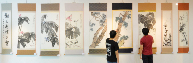 전주 덕진구 주민자치프로그램인 서화작품 전시회가 14일 전주 덕진공원에서 ‘묵향이 그윽한 한 여름의 풍경전’이란 이름으로 열린 가운데 시민들이 작품을 감상하고 있다.