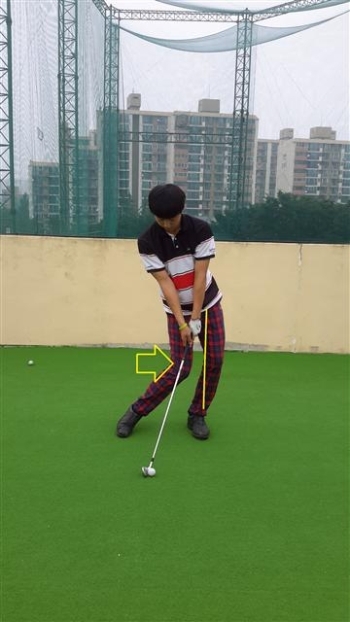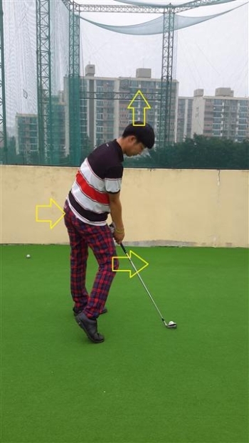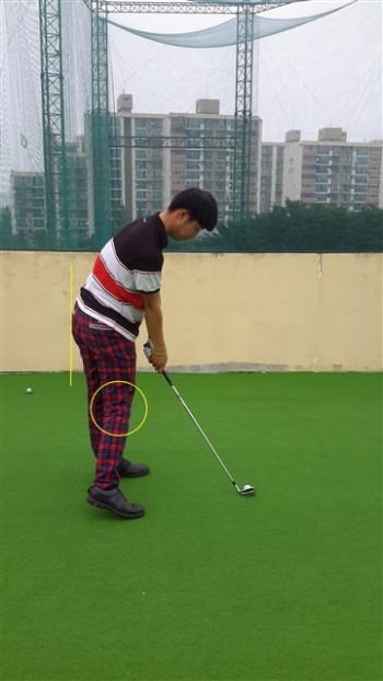 참고로 <사진1> 의 동작은 임팩트 시 오른 무릎이 앞쪽으로 움직이는 동작이다. 이렇게 되면 무릎이 움직이면서 엉덩이가 같이 움직이므로 상체가 일어나는 얼리익스텐션이 만들어지며, 몸과 볼의 거리가 가까워져 볼이 클럽의 안쪽에 맞는 생크가 많이 만들어진다.