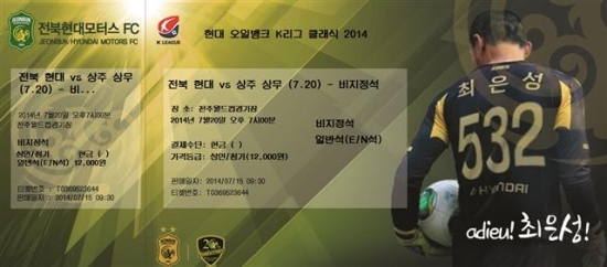 ▲ 오는 20일 전주월드컵경기장에서 열리는 상주 상무와의 홈 경기 입장권. 최은성 선수의 은퇴를 기념해 특별히 제작됐다.