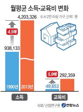이 보고서에 따르면 도시 2인 이상 가구의 월평균 교육비는 1990년 4만9653원에서 2013년 29만2359원으로 5.9배 늘었다.