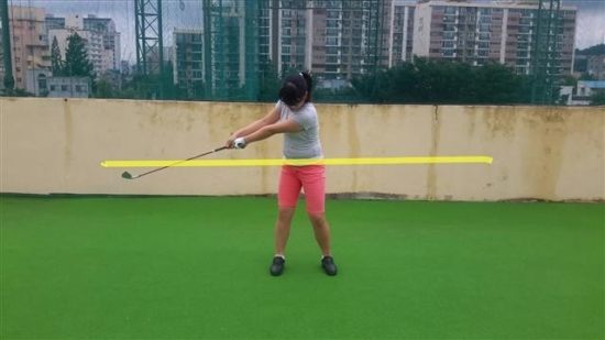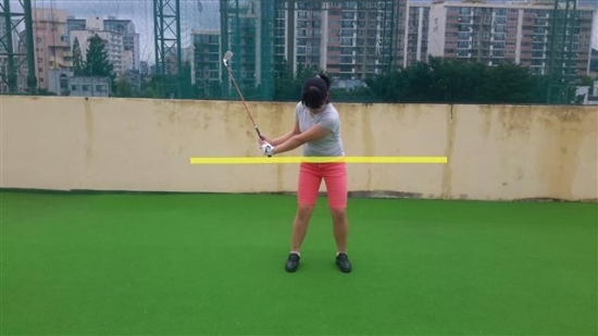 연습하는 방법은 <사진3> 과 같이 기다란 스틱을 허리의 벨트부분에 끼워서 연습을 하는 것이다. 다운스윙을 하면서 손이 최대한 스틱 밑으로 내려가고 클럽의 헤드는 최대한 늦게 스틱 밑으로 내려가게 연습을 하면 캐스팅 동작이 교정될 것이다. 사진3>
